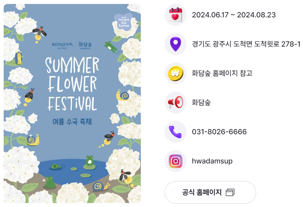 - 내용 : 화담숲의 계절별 다양한 꽃과 나무들의 이야기를 듣는 힐링 테마 숲 해설