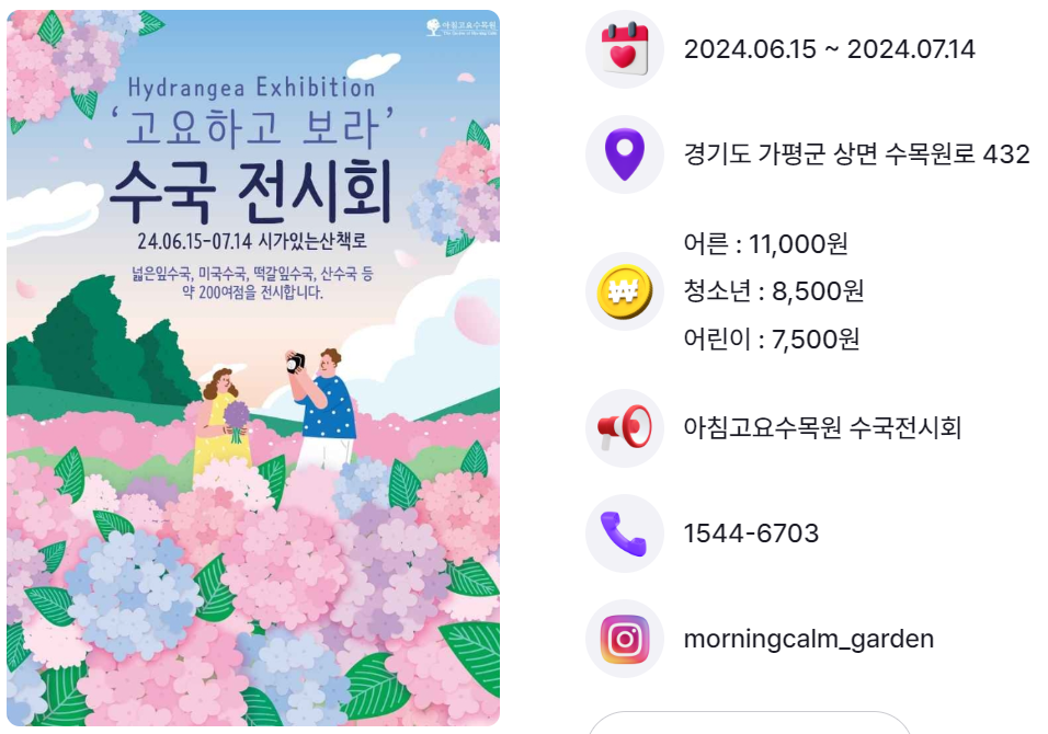 ⭐ 주요프로그램: 초여름에 가장 아름다움을 뽐내는 100여 품종의 7만여 본의 다채로운 수국 물결의 화려한 향연